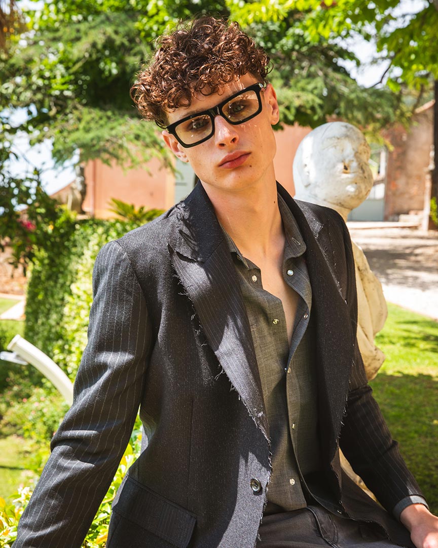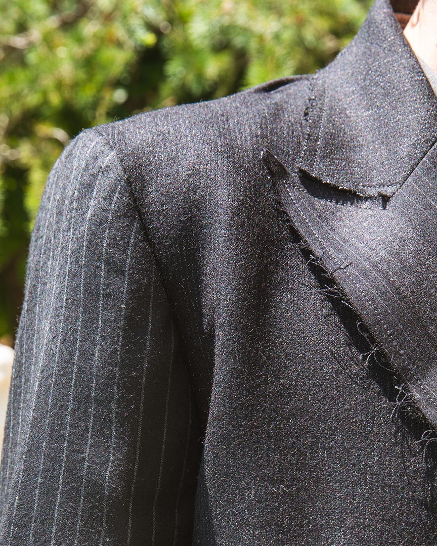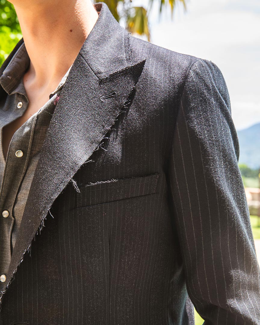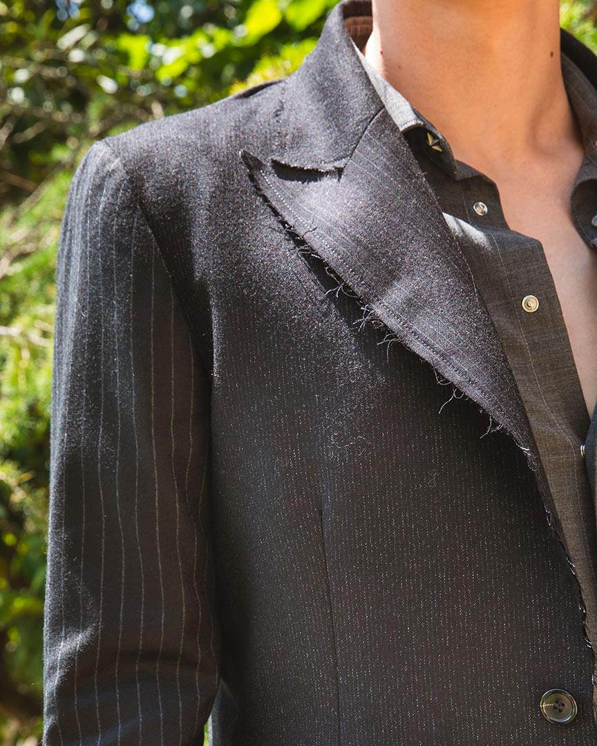 Giacca patchwork con tagli vivi sui bordi e sui revers