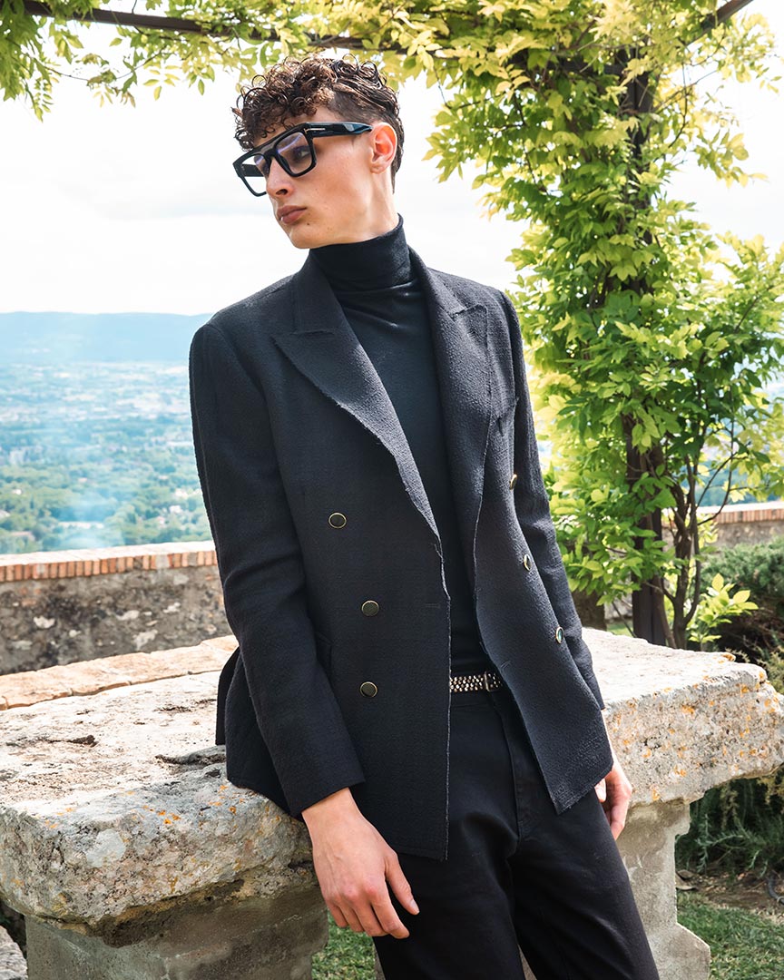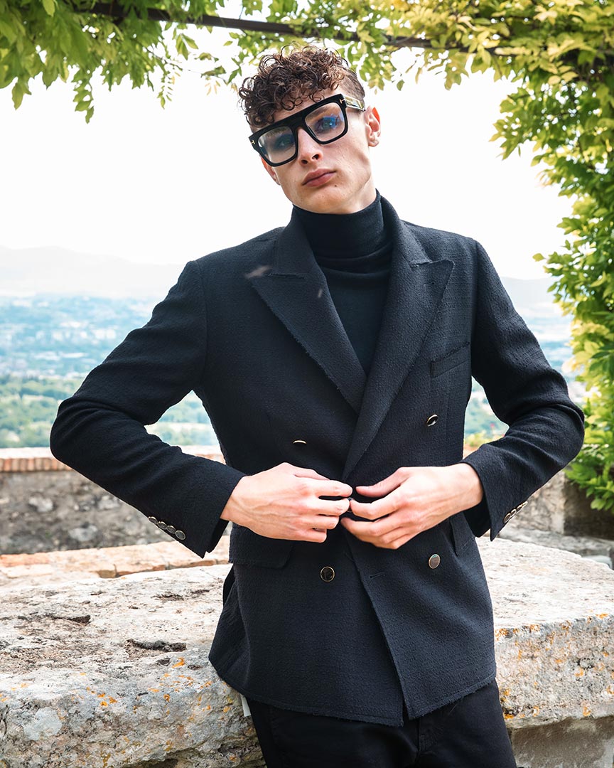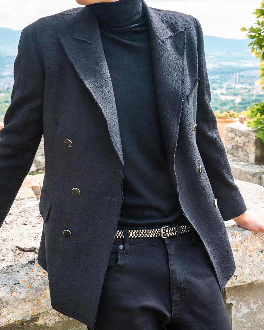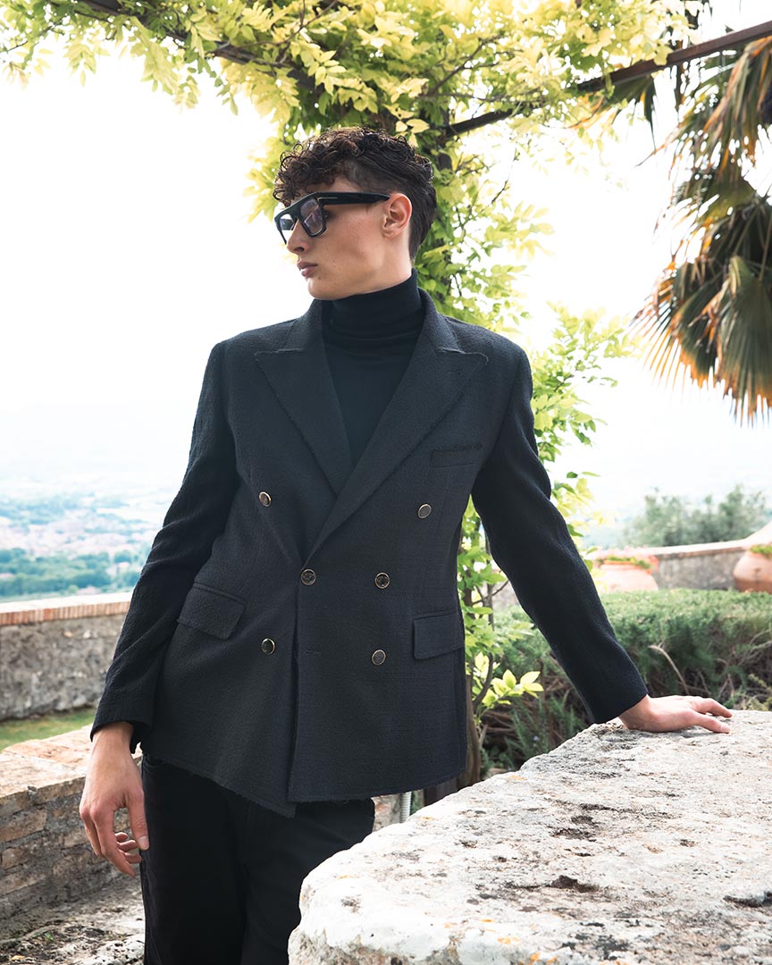 Giacca doppiopetto lana bouclé nera con taglio vivo con bottone gioiello nero