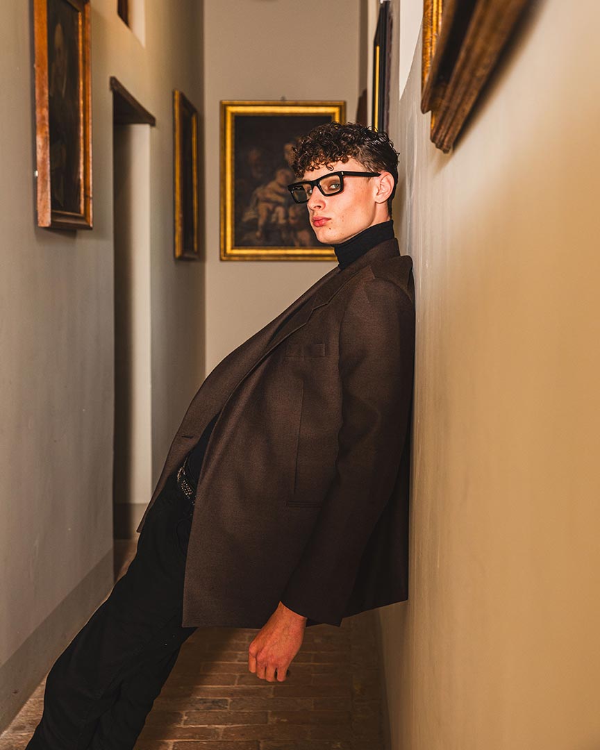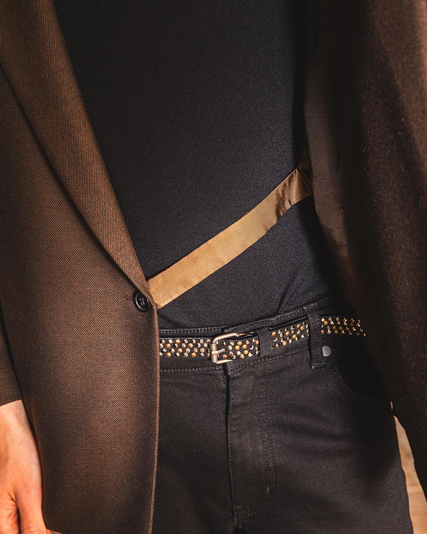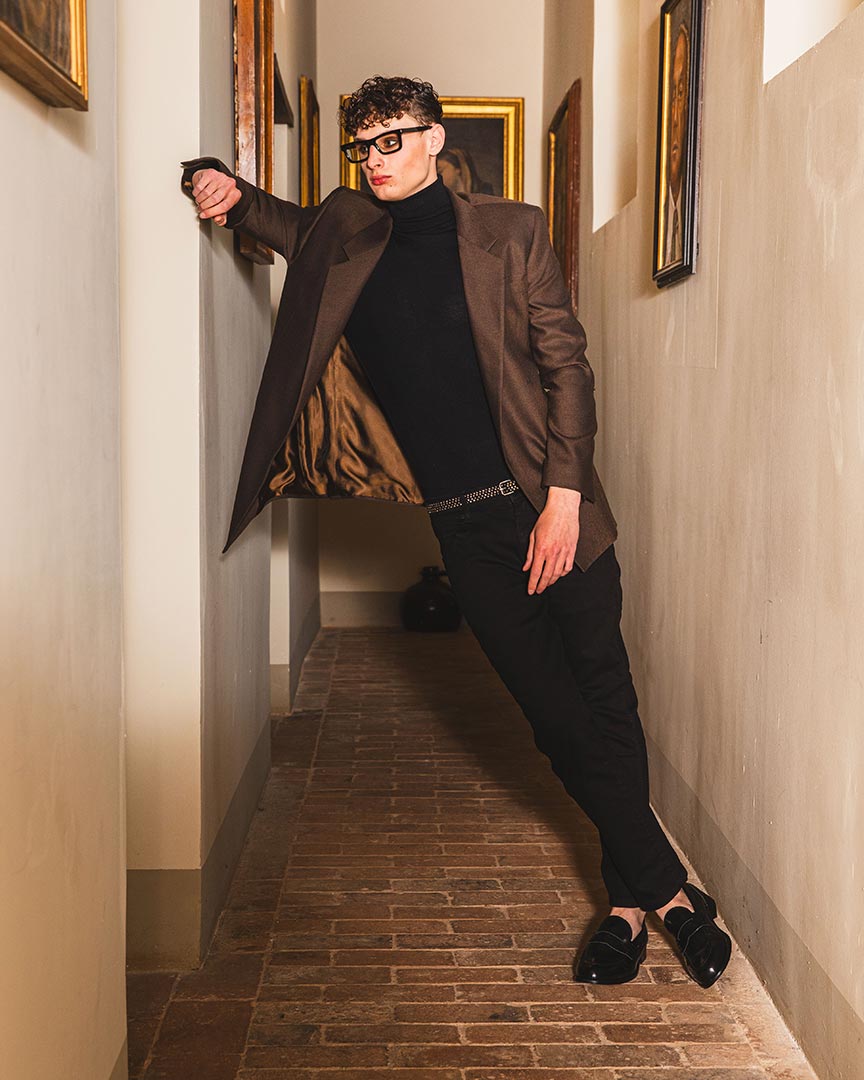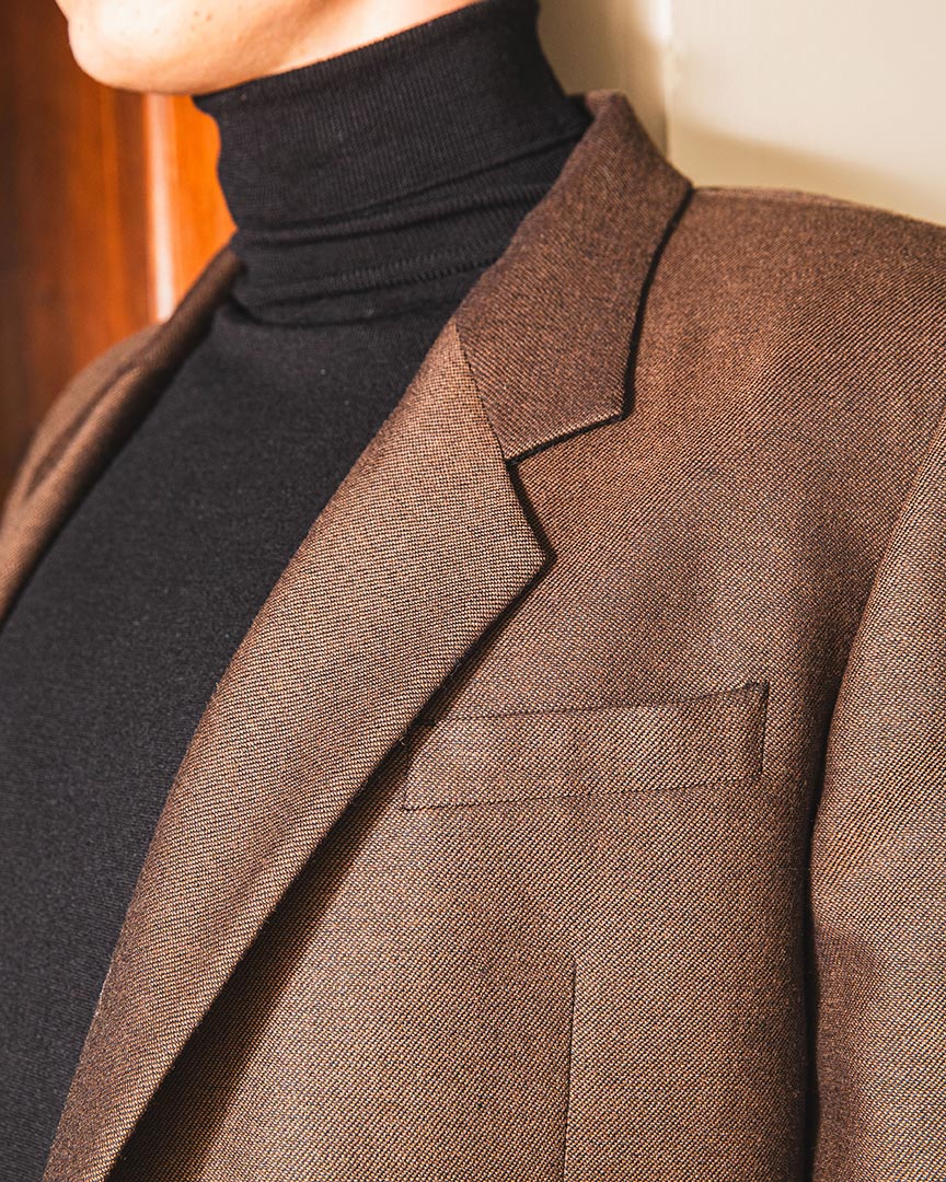 Giacca monopetto tessuto fantasia diagonale color cacao, con abbottonatura nascosta
