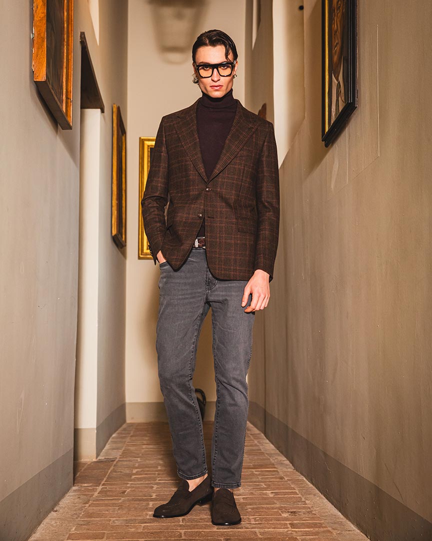 Giacca monopetto in pura lana vergine con fantasia quadri