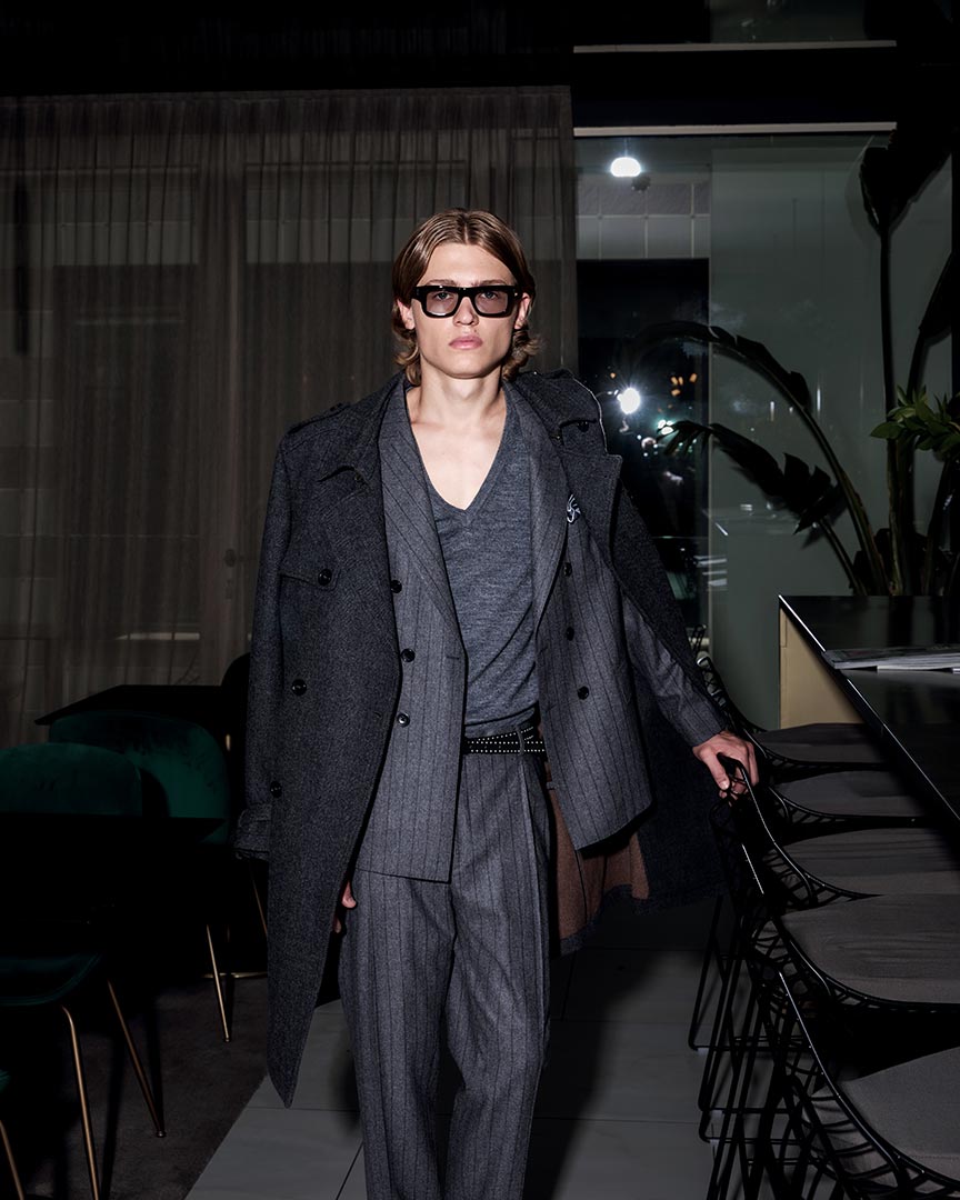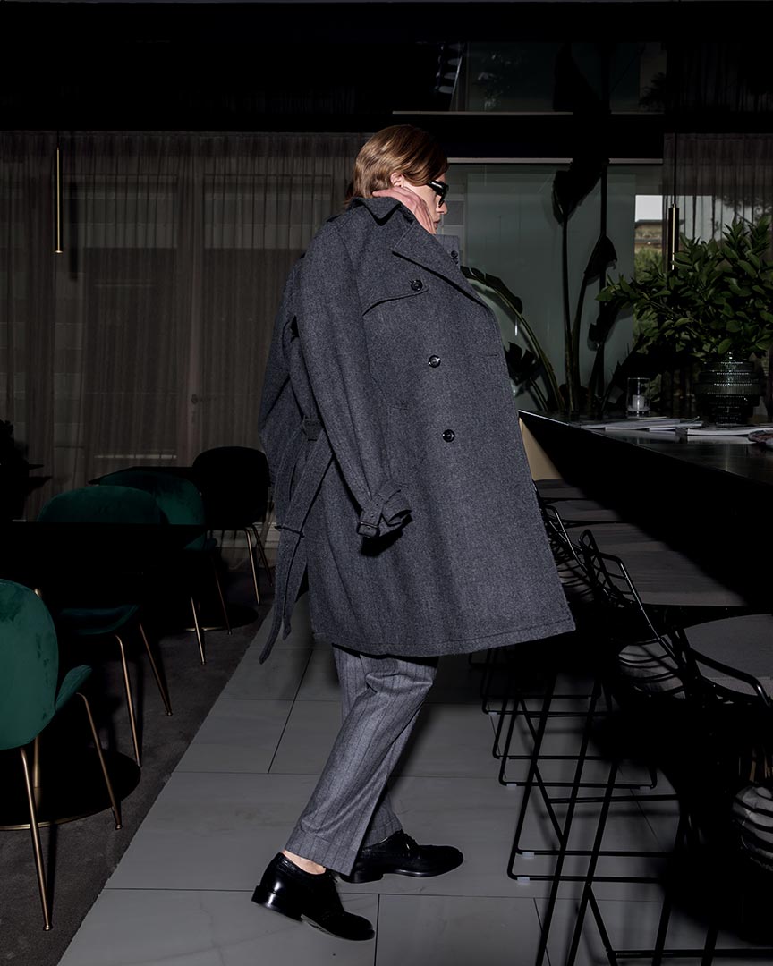 In lana, dalla fantasia spinata. Il cappotto è realizzato in tessuto double.